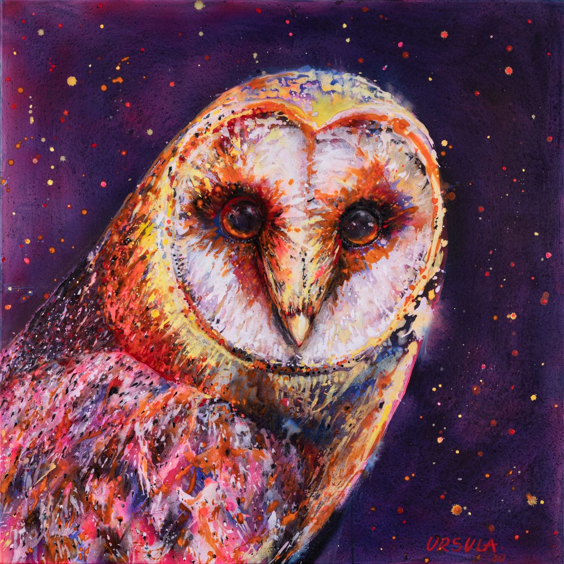 The Glowing night depicts a colourful barn owl that glows in a starred night. Created during the Covid -19 pandemic to light up the darkness and fears.The barn owl has its eyes wide open , we can’t escape from its sight, we have to look
