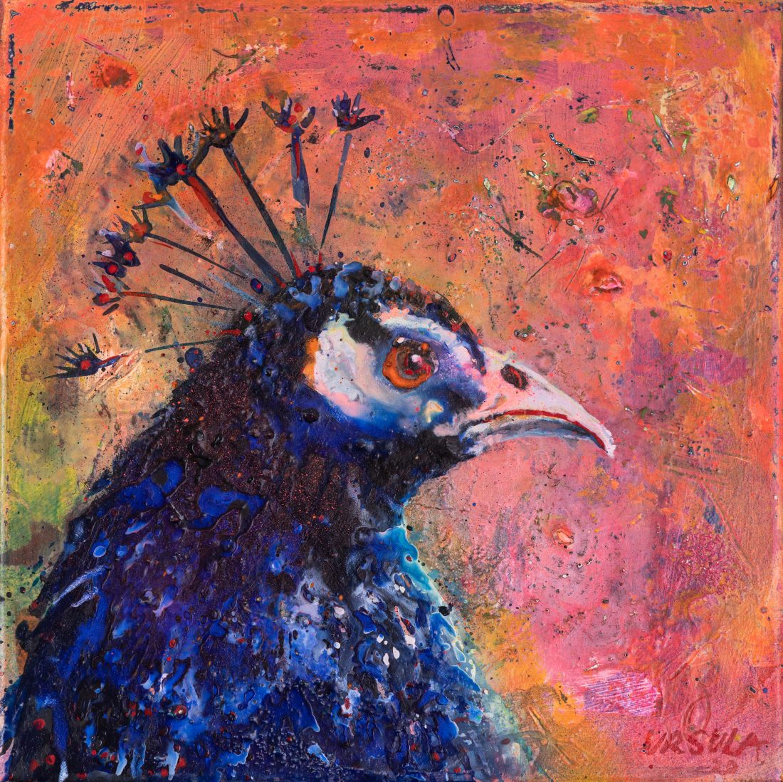 My interest in birds is related to their restless, vibrant and quick beating heart, along with their apparently volatile personality. With The peacock I wanted to represent these features with colours and texture without depicting the most eye-catching part of this bird, its tail. Year 2020 Medium Mixed media