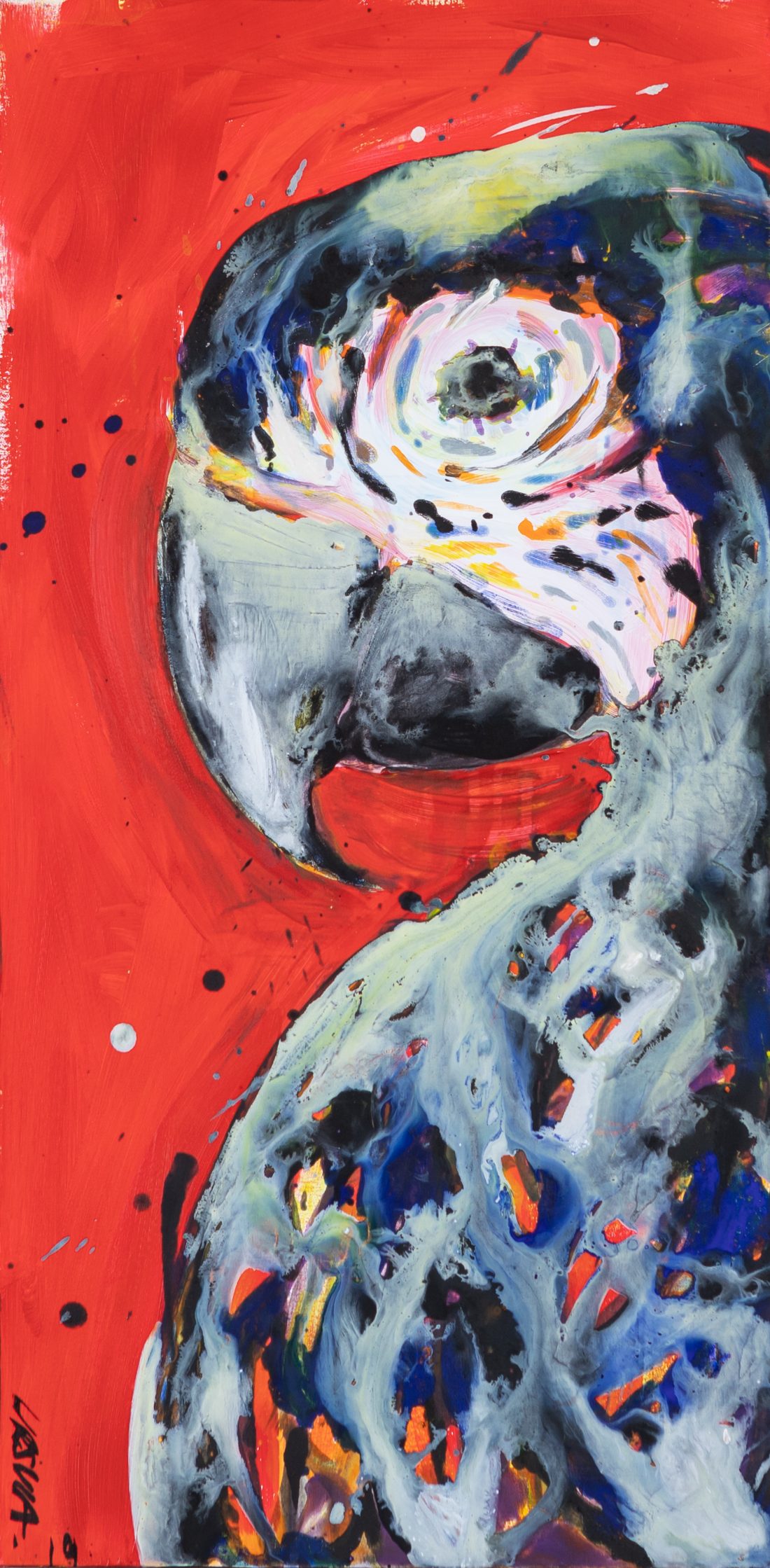 The bird portrays a parrot whose colours merge with the background representing the strong connection that we all have with our surroundings. Red as intense as the bird's gaze invites us to self-reflection. Year 2019 Medium Acrylic paint on canvas Height/Width/Depth : 80 x 40 x 3,5 cm 31,4