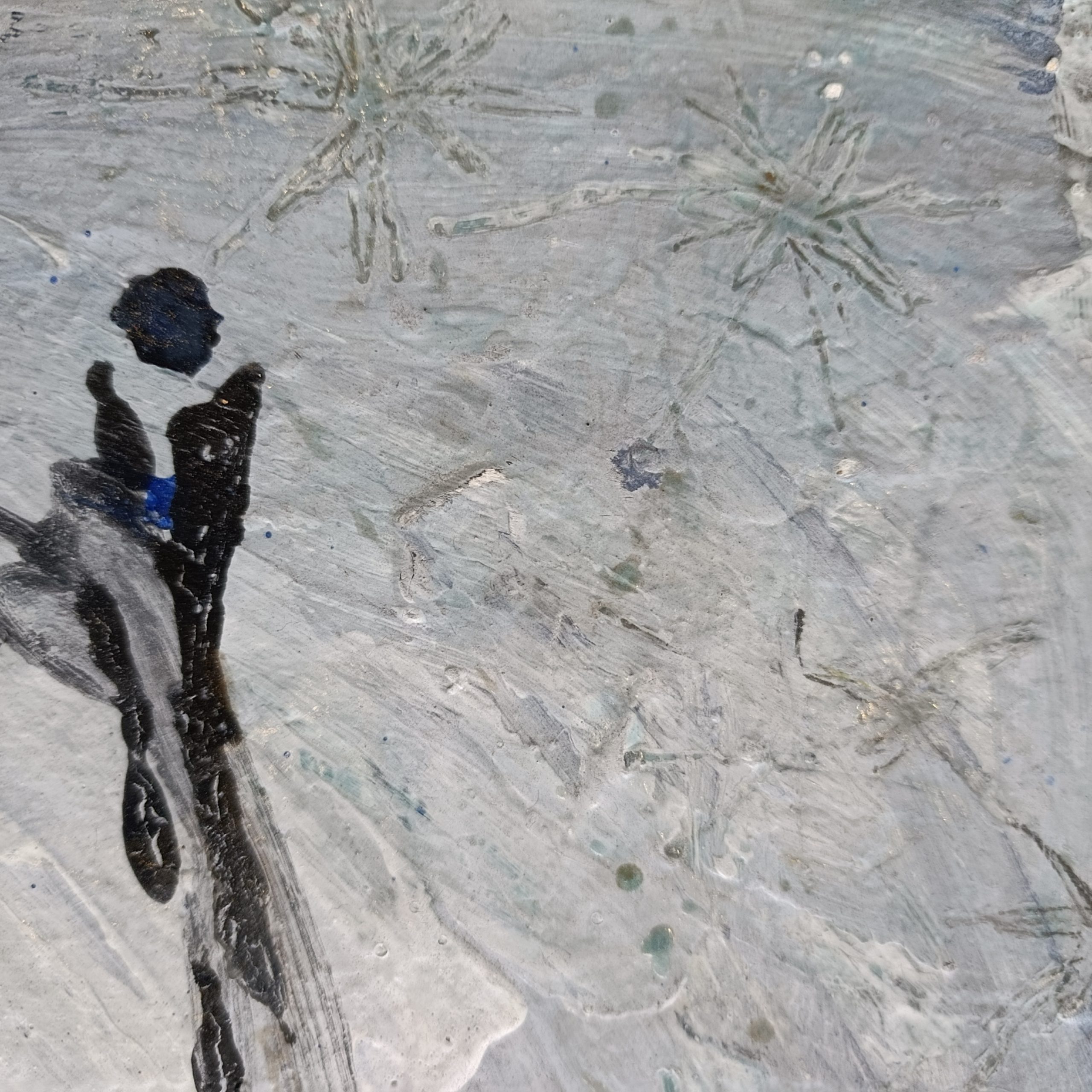Precious, (hace referencia al texto del cuadro: la preciosa vida de un insecto). El cuadro muestra un escarabajo de color azul ultramar con chispas doradas, como si el caparazón fuera hecho de Lapislázuli, la piedra preciosa que los egipcios utilizaron en tantas obras y decoraciones. Los egipcios asociaban el color azul y dorado de la gema con el Cosmos, el cielo nocturno estrellado y los Dioses, especialmente en el más allá. El escarabajo pelotero también se consideraba sagrado por su capacidad regeneradora. Este cuadro es fruto de mi reflexión sobre el valor que el hombre otorga a la vida… considerando sólo valiosas ciertas vidas. ¿O cuántos de nosotros intenta sacar un insecto de casa cuidadosamente antes de matarlo? Para lo más grande nosotros, La Vida… nosotros quizás también somos un insectos.